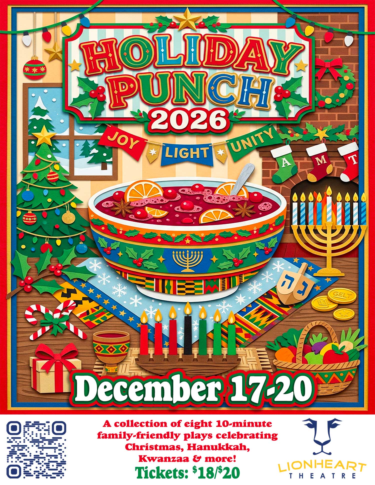 The Lionheart Theatre Company is pleased to announce the return of “Holiday Punch,” a collection of 8, 10-minute family-friendly plays all dealing with the comedy, warmth and sometimes drama of the holiday season – Christmas, Hanukkah, Kwanzaa, and more.